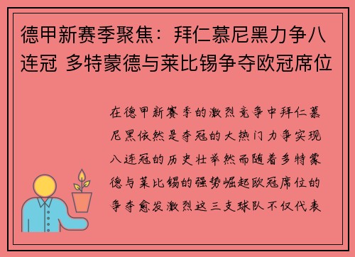 随着2023-2024赛季的德甲联赛逐渐进入白热化阶段,拜仁慕尼黑和多特蒙德这两支传统豪门再次走到了争冠的前沿。两队之间的头名争夺战引发了球迷和媒体的广泛关注,不仅仅因为他们之间的历史渊源,也因为两支球队在本赛季展现出的出色状态。这场争夺不仅是关于冠军荣誉的较量,更是关于德甲未来方向的深刻反思。从球员状态、战术打法、历史对比以及球迷反应等多个角度来看,拜仁与多特之间的争斗注定将会成为德甲赛季最热的...