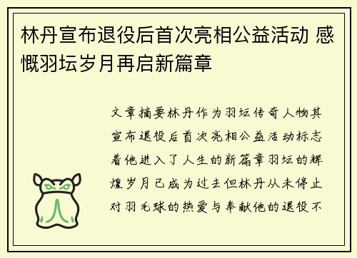 林丹,这位羽毛球史上的传奇人物,凭借其无数的荣耀和突破性的成就,早已成为羽毛球运动中的标志性人物。近年来,尽管年事已高,他依旧不断刷新着自己的纪录。对于林丹来说,东京奥运会不仅是他职业生涯的又一次挑战,更是他对自己羽毛球历史地位的进一步巩固。在东京奥运会之际,林丹做出了重返赛场的决定,他的目标锁定羽毛球历史第六冠。这一目标的实现不仅对林丹个人意义重大,同时也对羽毛球运动的发展与未来产生深远影响。本...