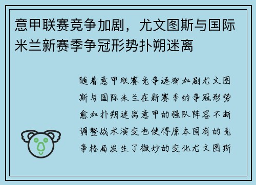 在2025赛季的意甲联赛中,尤文图斯和国际米兰的表现成为了媒体和球迷关注的焦点。尤文图斯在遭遇开局困境后,逐步找回状态,凭借一波连胜成功突破了罗马的逆袭。而国际米兰则在锋线上展现出强势崛起的势头,通过一系列精彩的进攻表现再次证明了自己在意甲赛场的统治力。本文将从四个方面对本赛季的意甲新动态进行详细阐述,包括尤文图斯连胜突破罗马逆袭、国际米兰锋线强势崛起、尤文图斯的战术调整以及意甲联赛的整体竞争格局...
