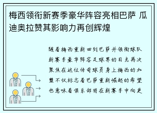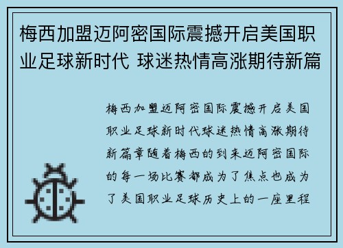 梅西正式加盟迈阿密国际,签约两年,成为球队历史上最重磅的引援。这一转会不仅震动了全球足坛,也使得美国大联盟(MLS)进入了全新的时代。梅西,作为全球公认的足球天才,他的加盟对于迈阿密国际队来说,意味着球队实力的急剧提升,而对于美国足球,也将是一剂强心针。本文将从梅西加盟的背景、他的影响力、对迈阿密国际队的实际意义以及对MLS未来的影响等四个方面进行详细阐述,全面解析梅西这一历史性转会的深远意义。1...